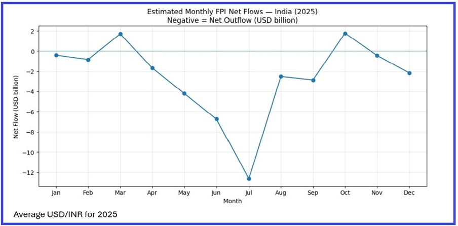 Foreign capital is neither entering India in sufficient scale, nor remaining invested. Portfolio outflows have become persistent, and this has emerged as the dominant driver of currency pressure. In calendar year 2025, foreign portfolio investors sold approximately USD 19–20 billion worth of Indian equities, marking one of the largest annual equity outflow episodes in recent years. Importantly, this selling has been sustained rather than episodic, pointing to a structural reassessment of India’s growth outlook and valuation premium rather than a temporary risk off shock.