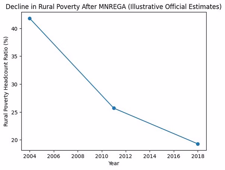 The figure above illustrates the broader context in which MNREGA operated. Rural poverty declined sharply after 2005, falling from over 40 per cent in the mid 2000s to below 20 per cent by the late 2010s. While this decline reflects multiple forces like overall growth, structural change, and social programs, micro-level studies consistently find that districts and households with higher exposure to MNREGA experienced significantly larger gains in consumption and poverty reduction compared to areas where the program was weakly implemented.